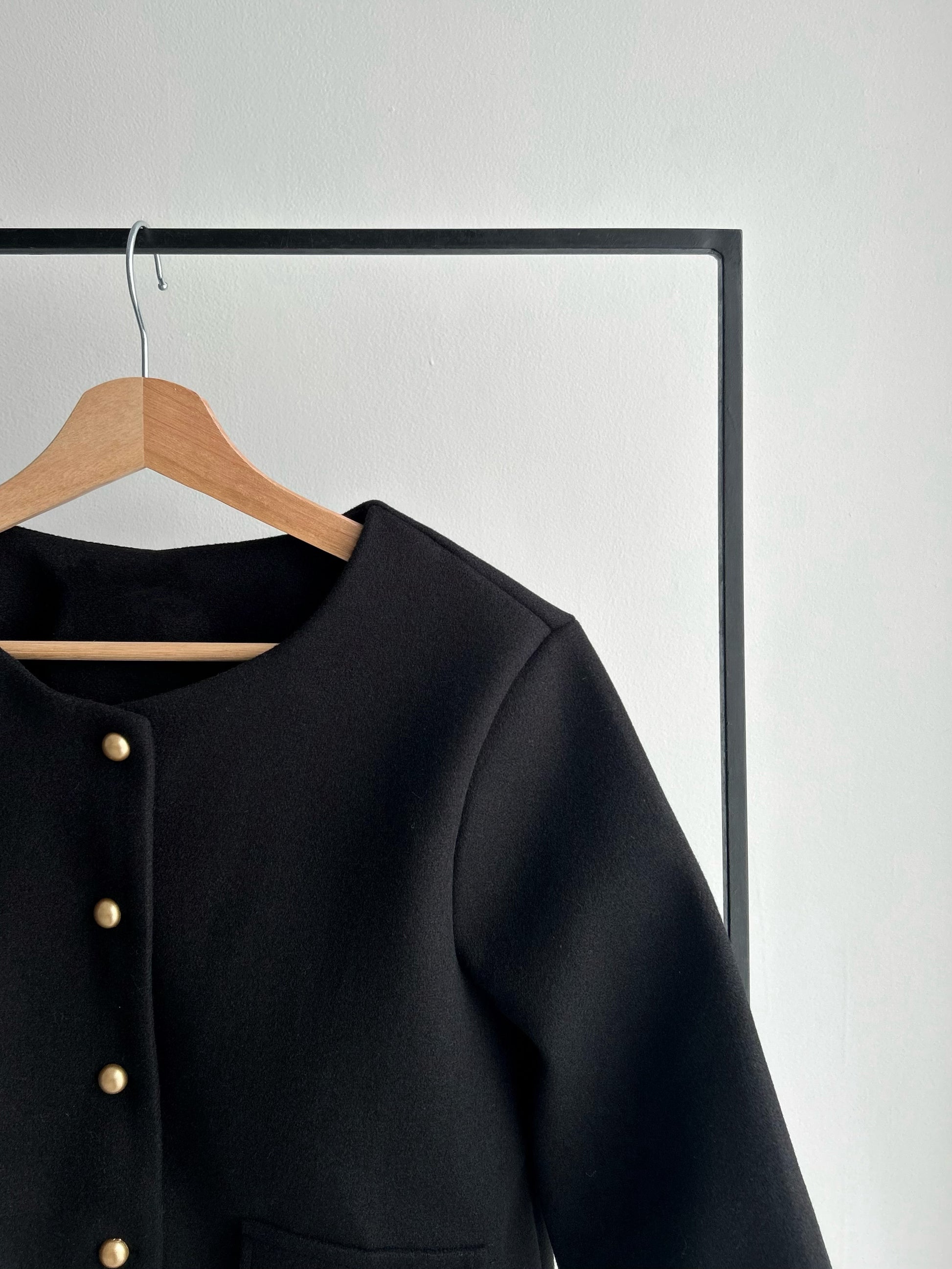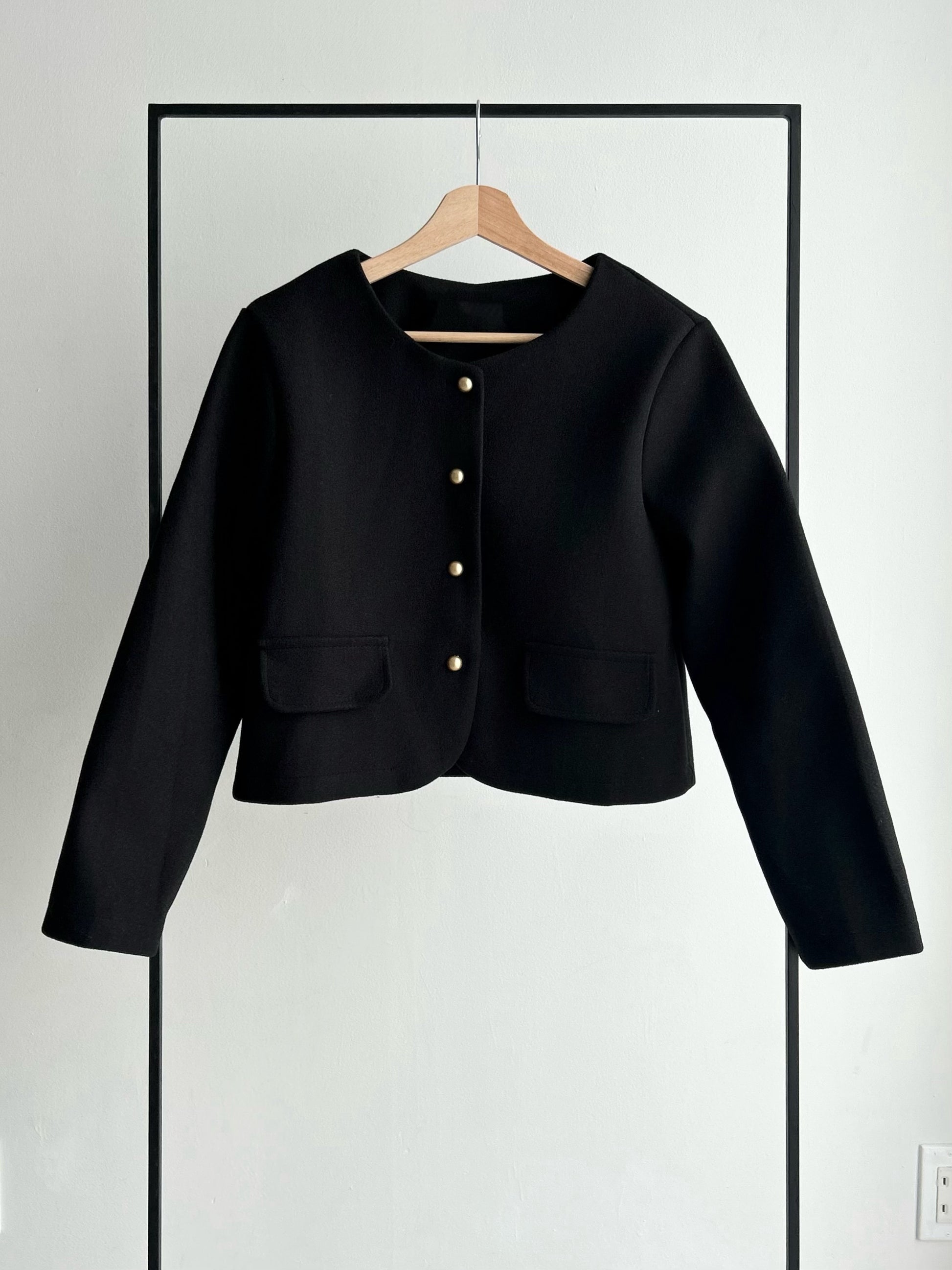 小さめのゴールドボタンがさりげないアクセントとなり、派手すぎず洗練された印象に。