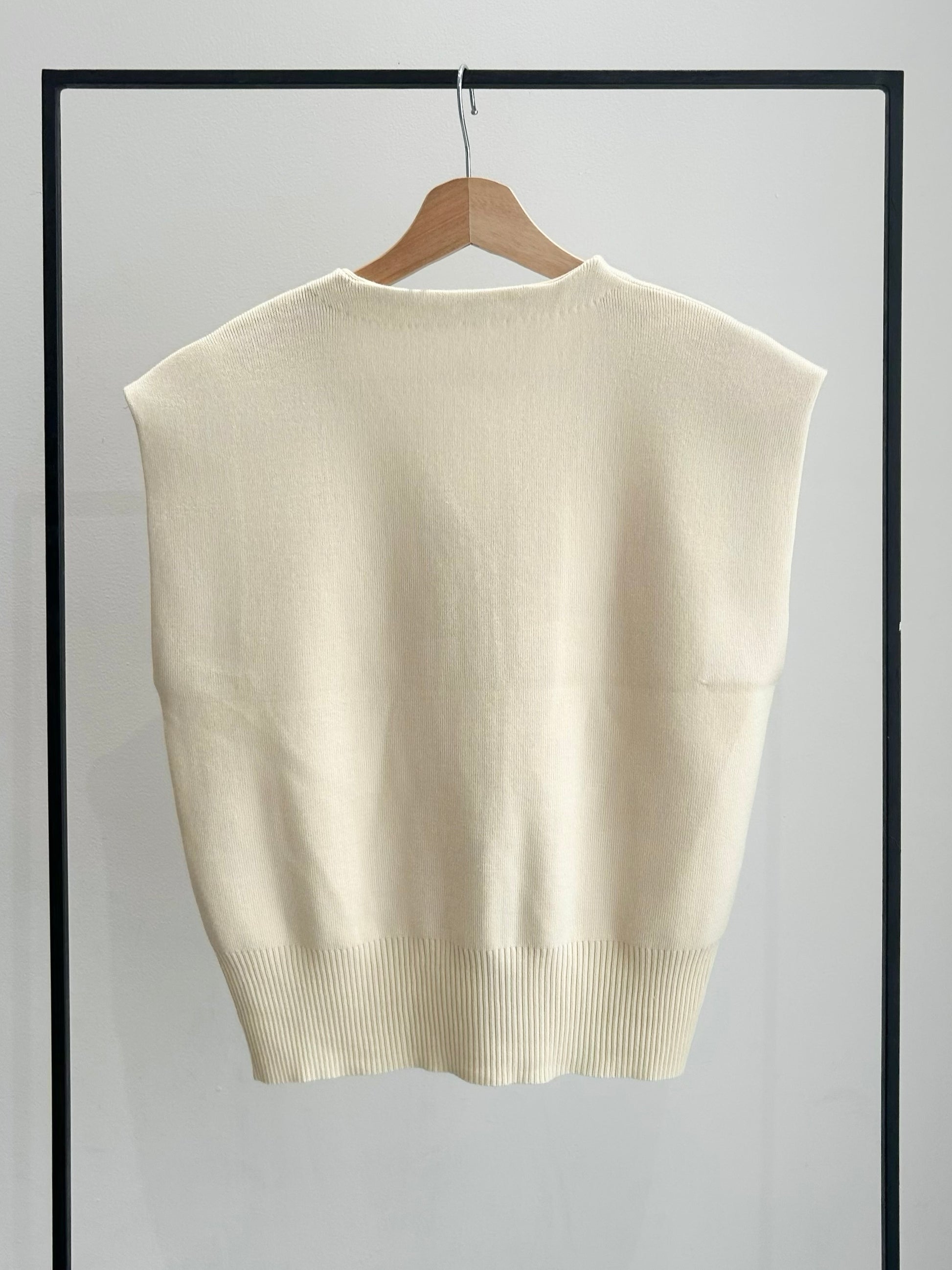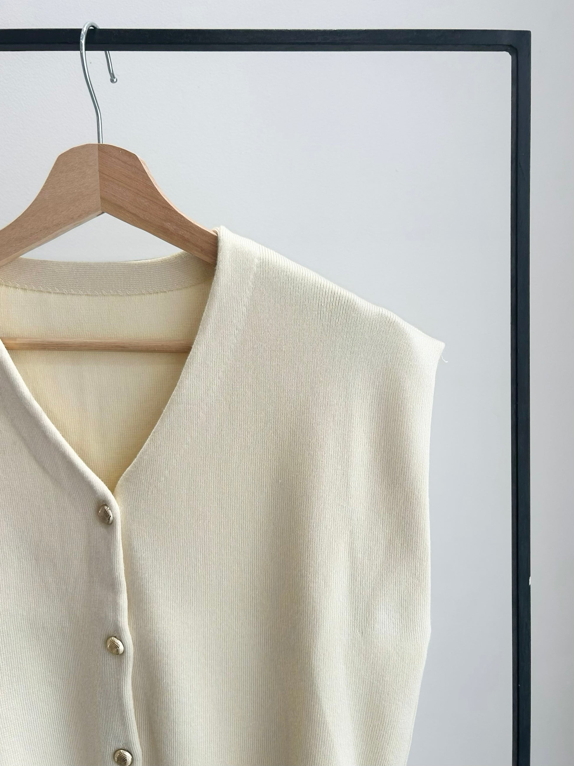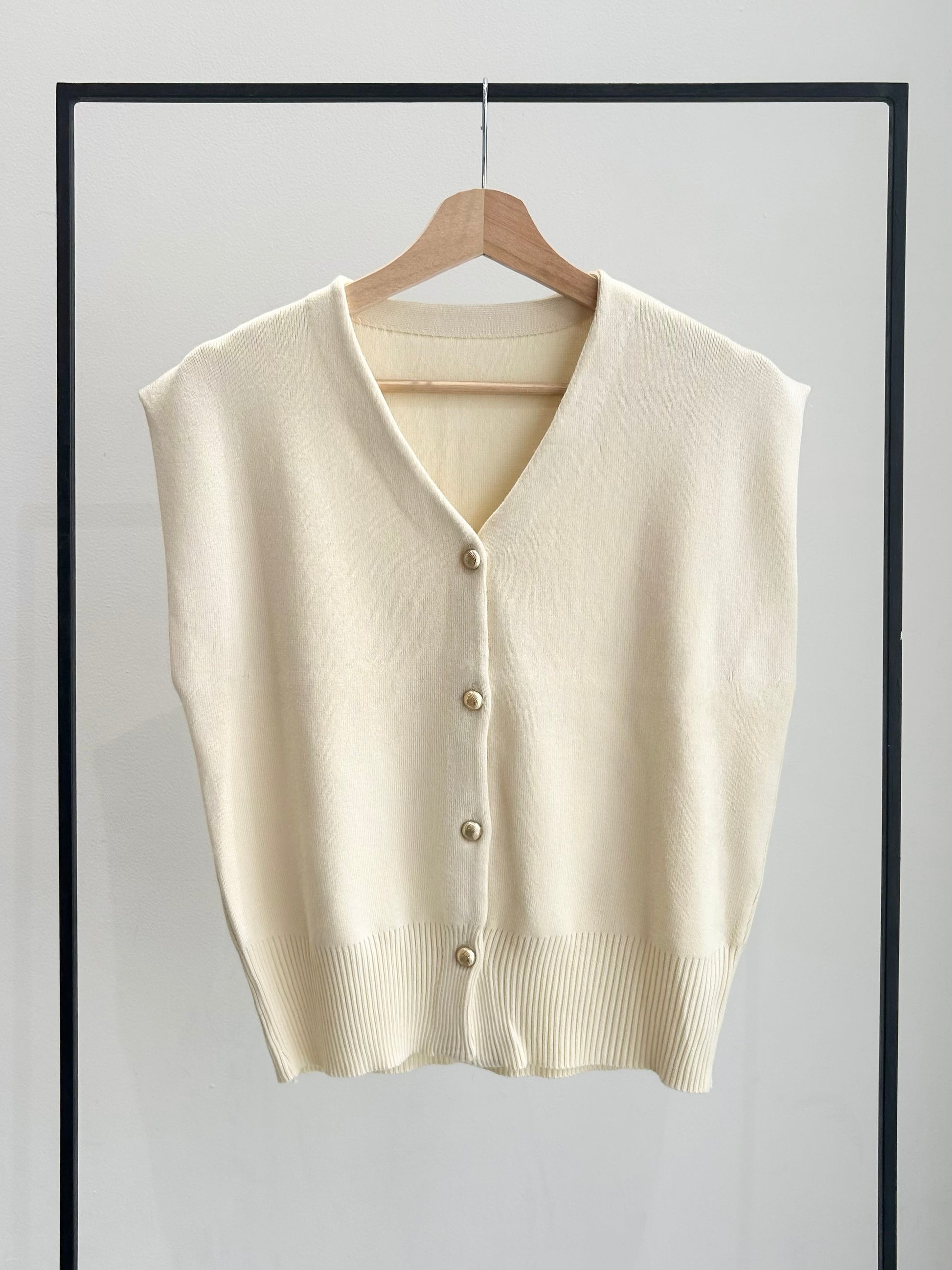 Vネックデザインとゴールドボタンが上品なアクセントを添えるノースリーブニットベスト。