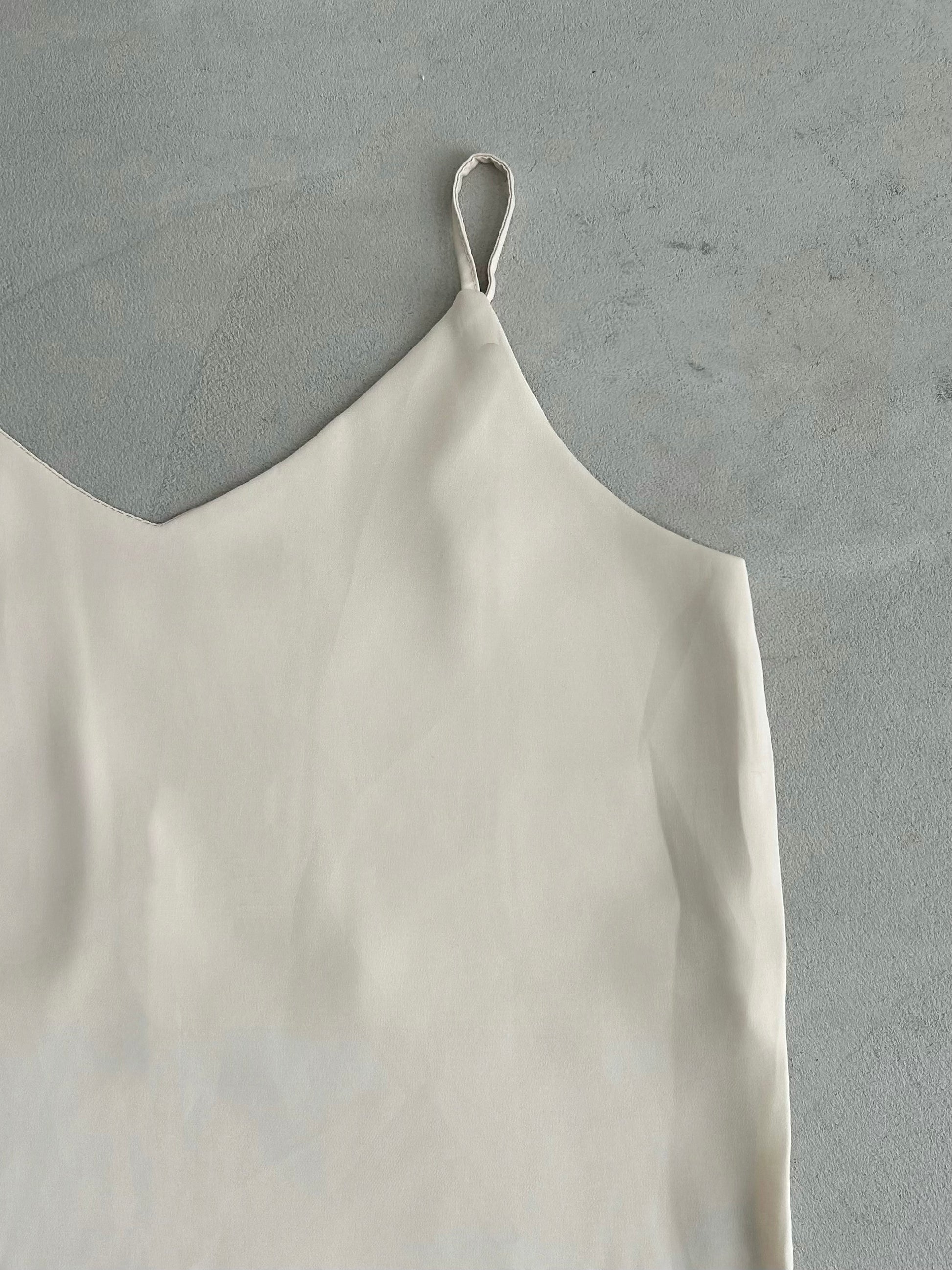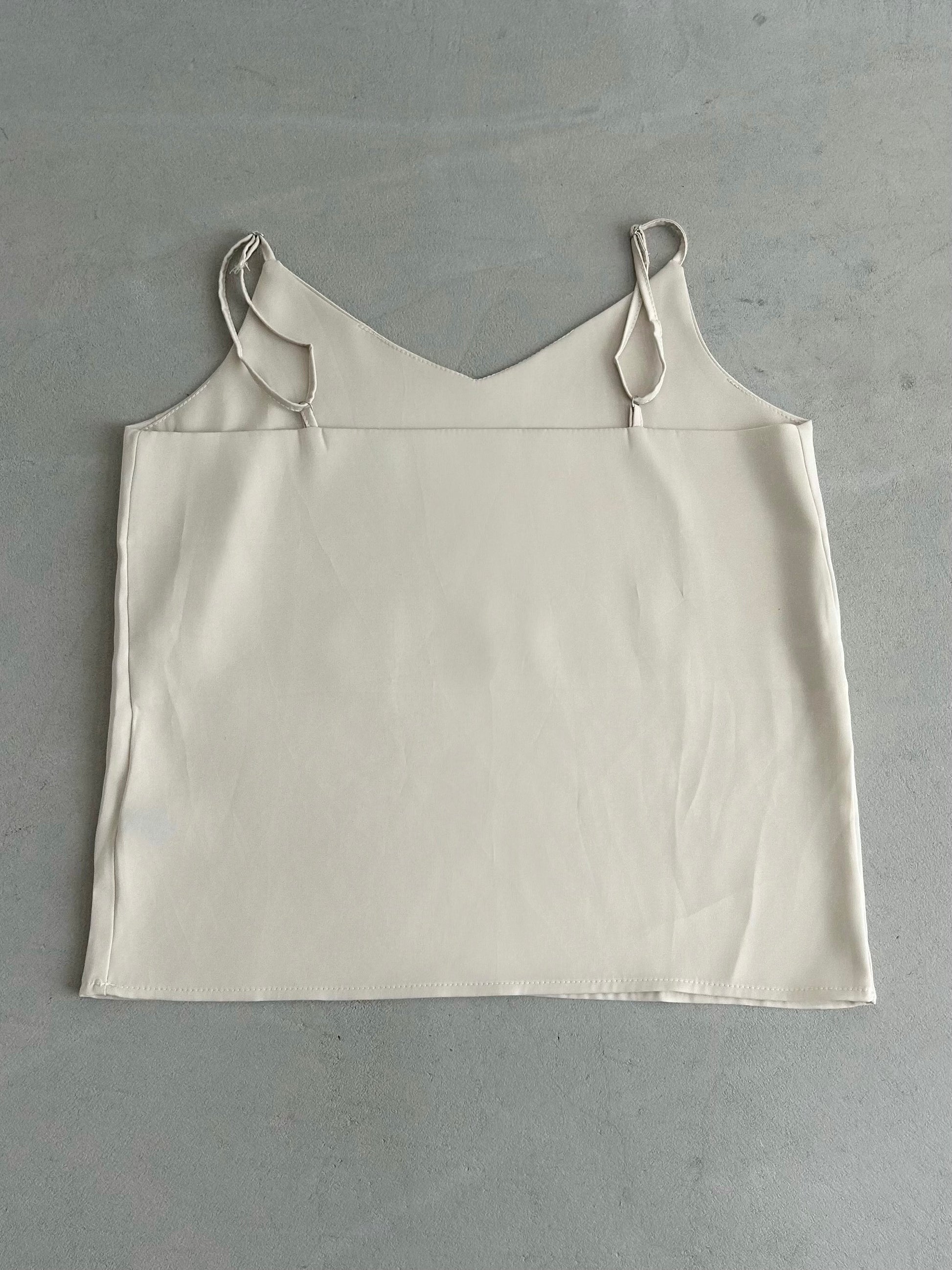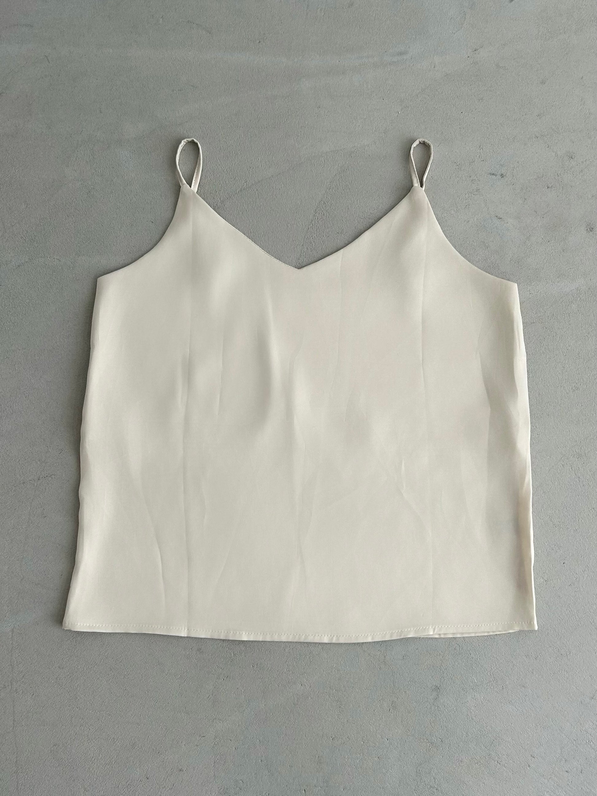 サテンのような滑らかで艶やかな素材感が目を引くキャミトップス。