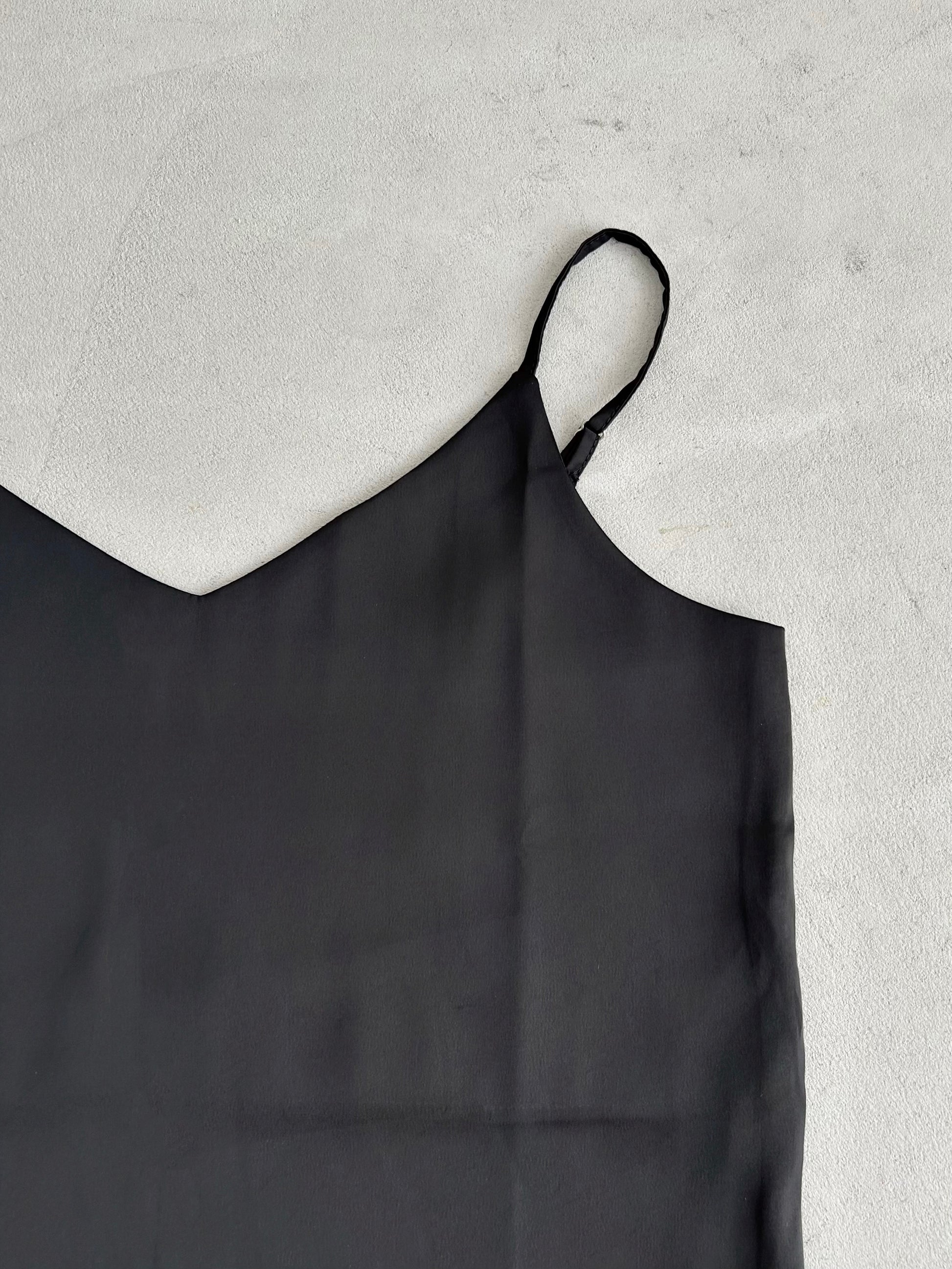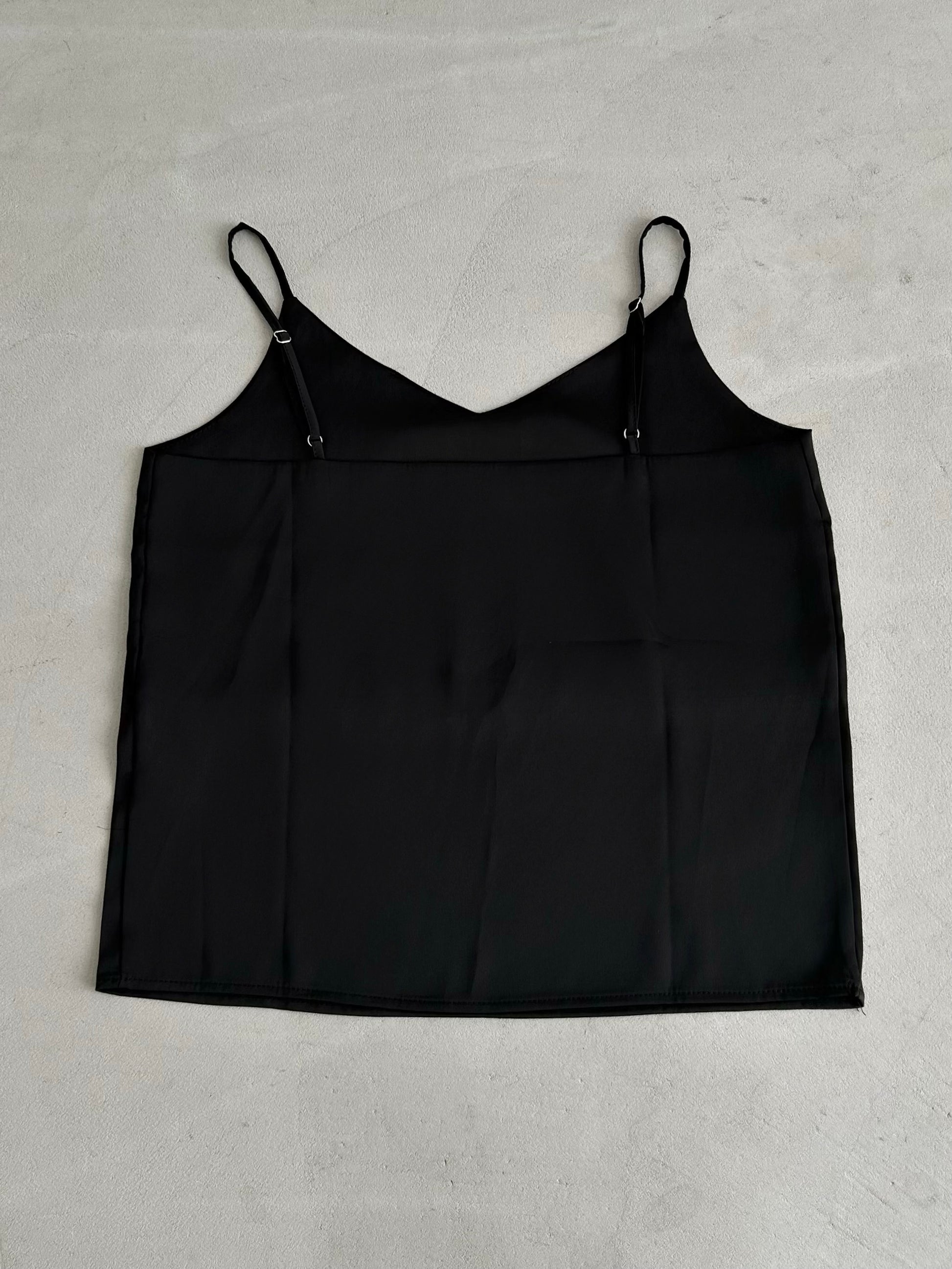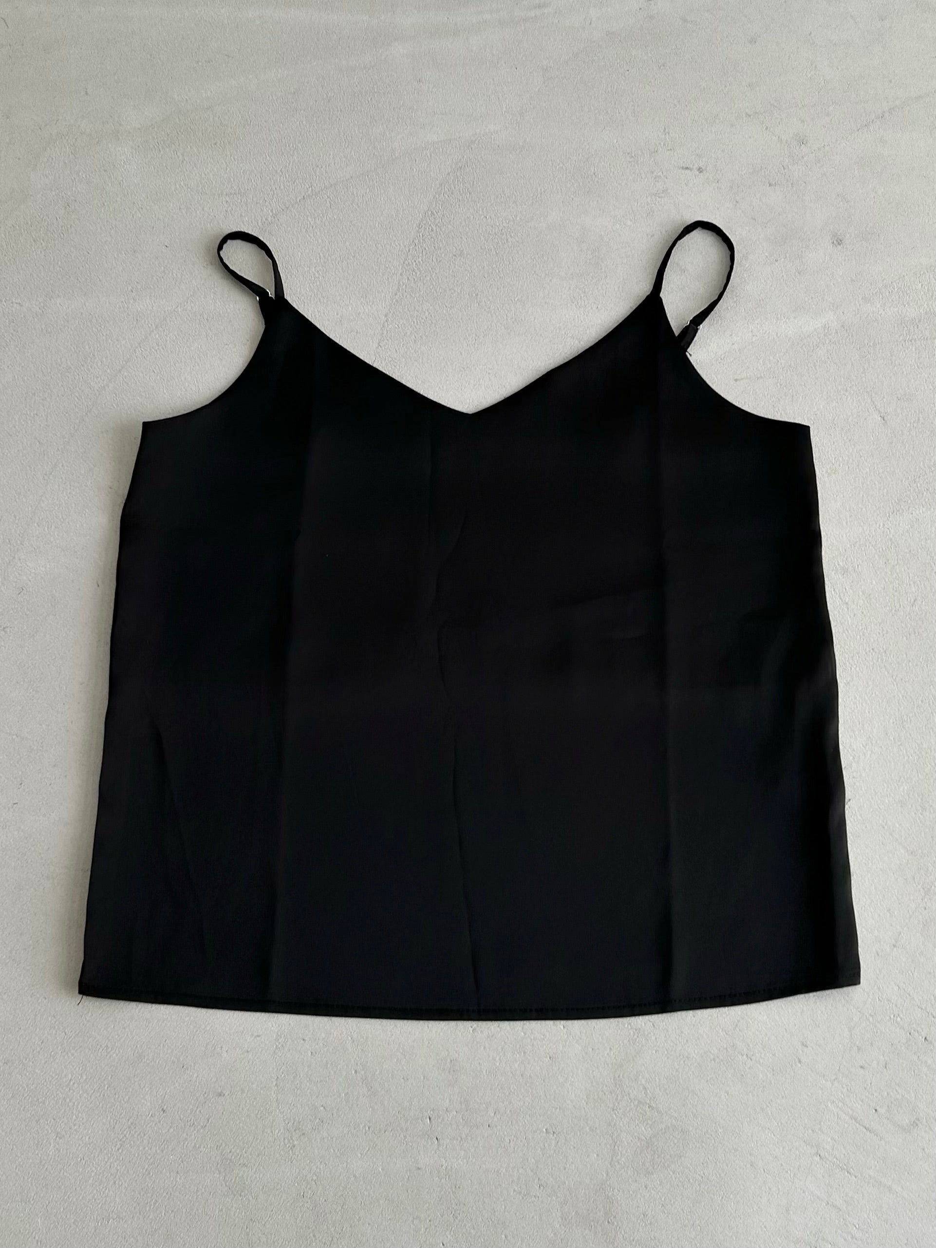 サテンのような滑らかで艶やかな素材感が目を引くキャミトップス。
