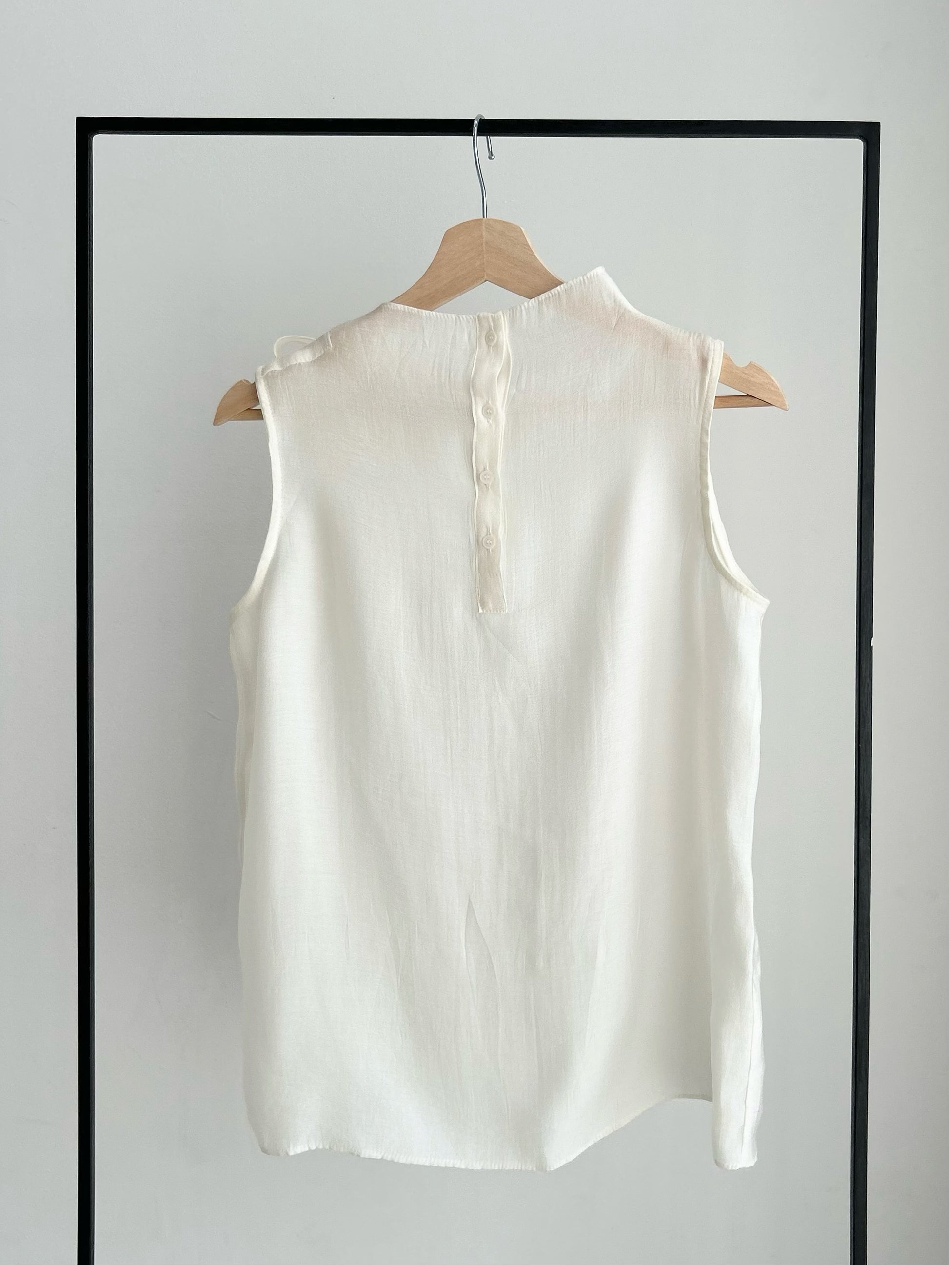 背面には小さなボタンを連ね、後ろ姿にまで静かな美しさを。スラックスやタイトスカートと合わせて、モードにもフェミニンにも着こなせます。