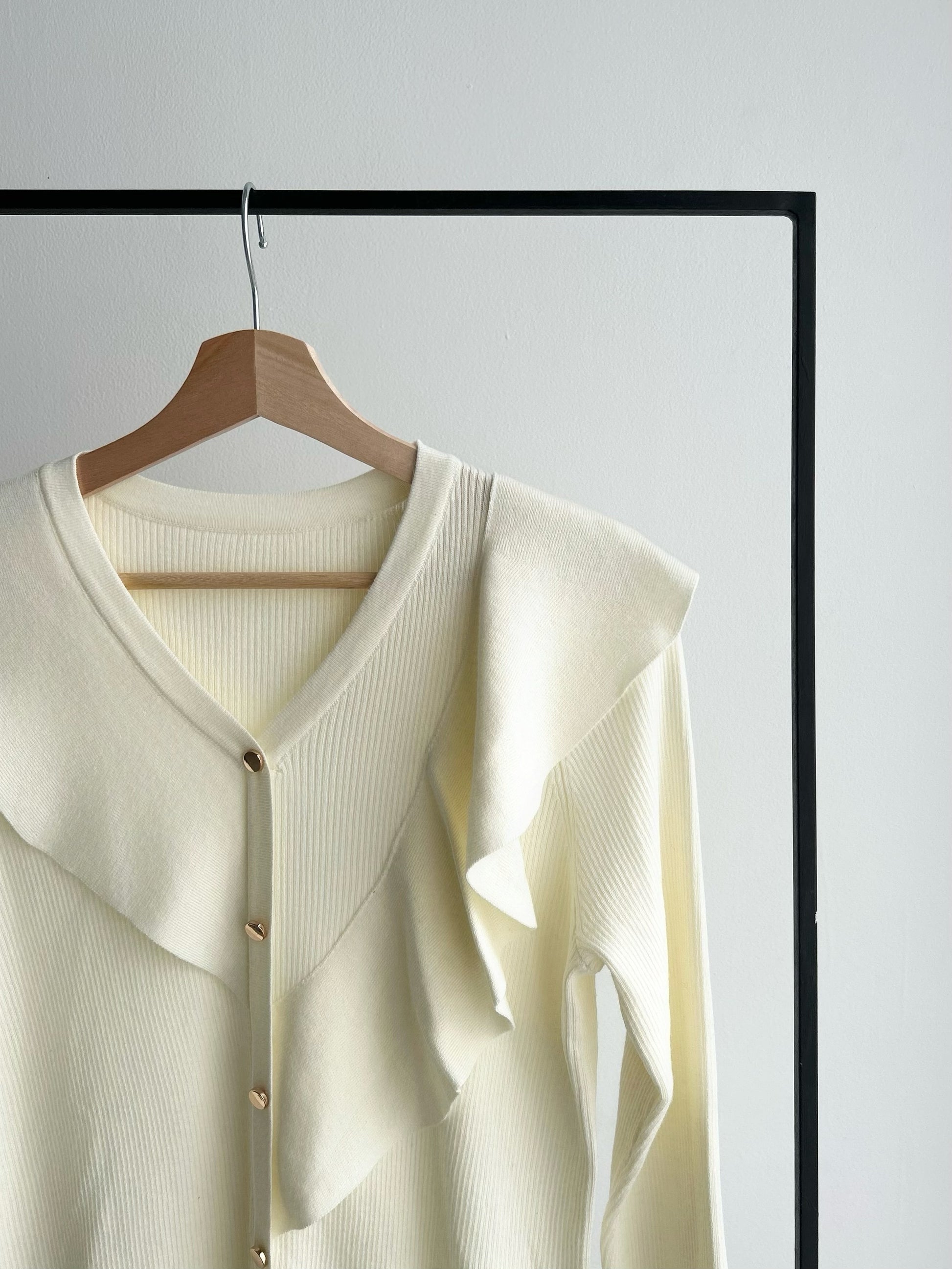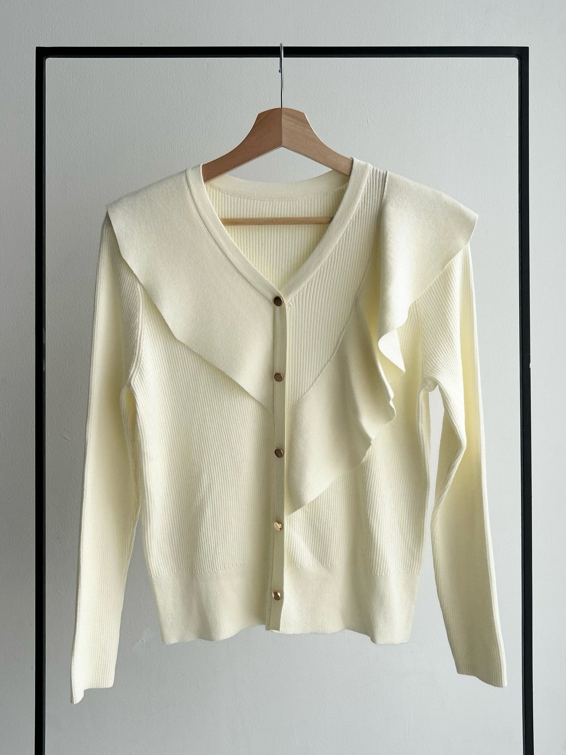 胸元に緩やかなアシンメトリーフリルをあしらったカーディガン。