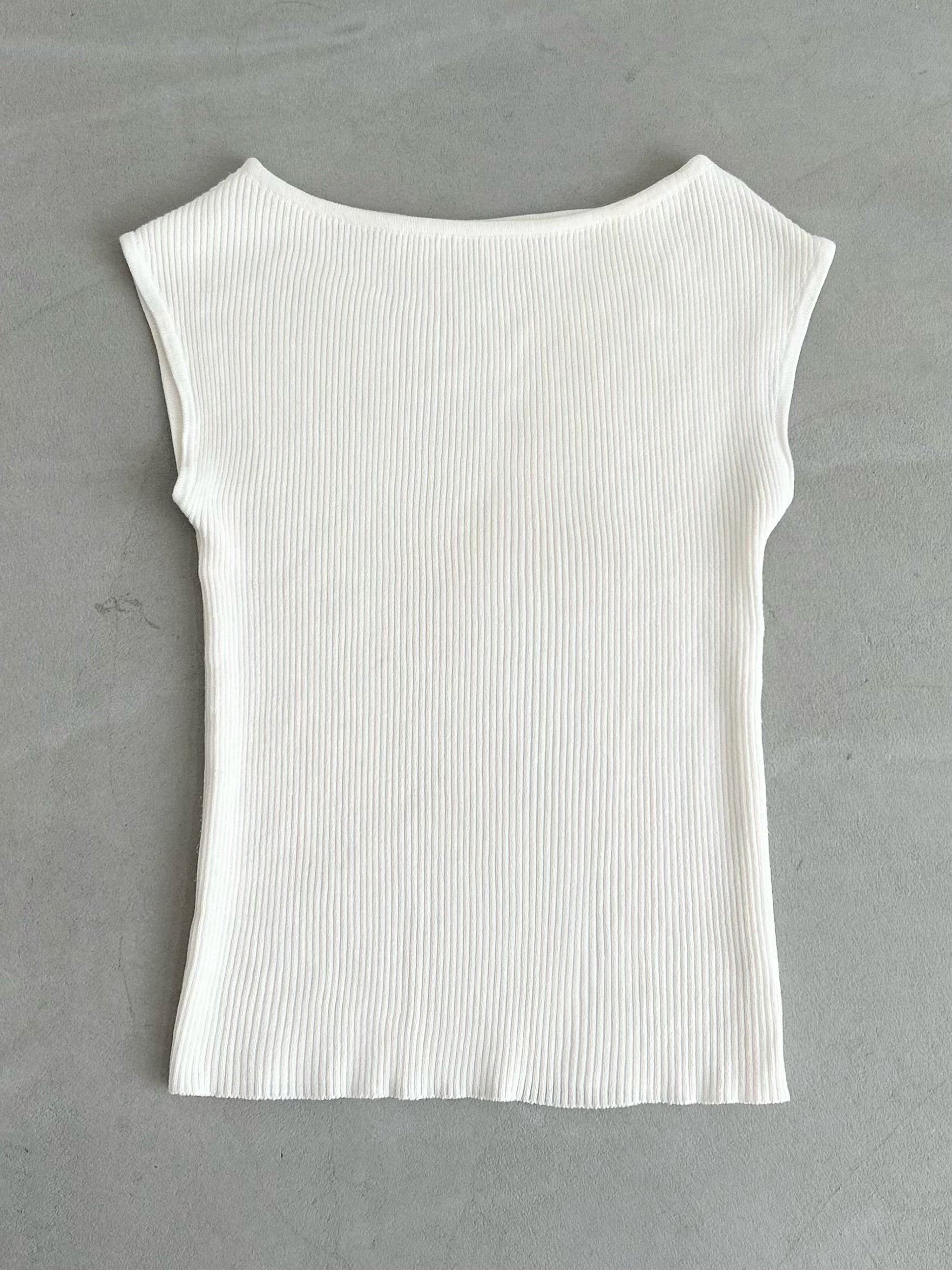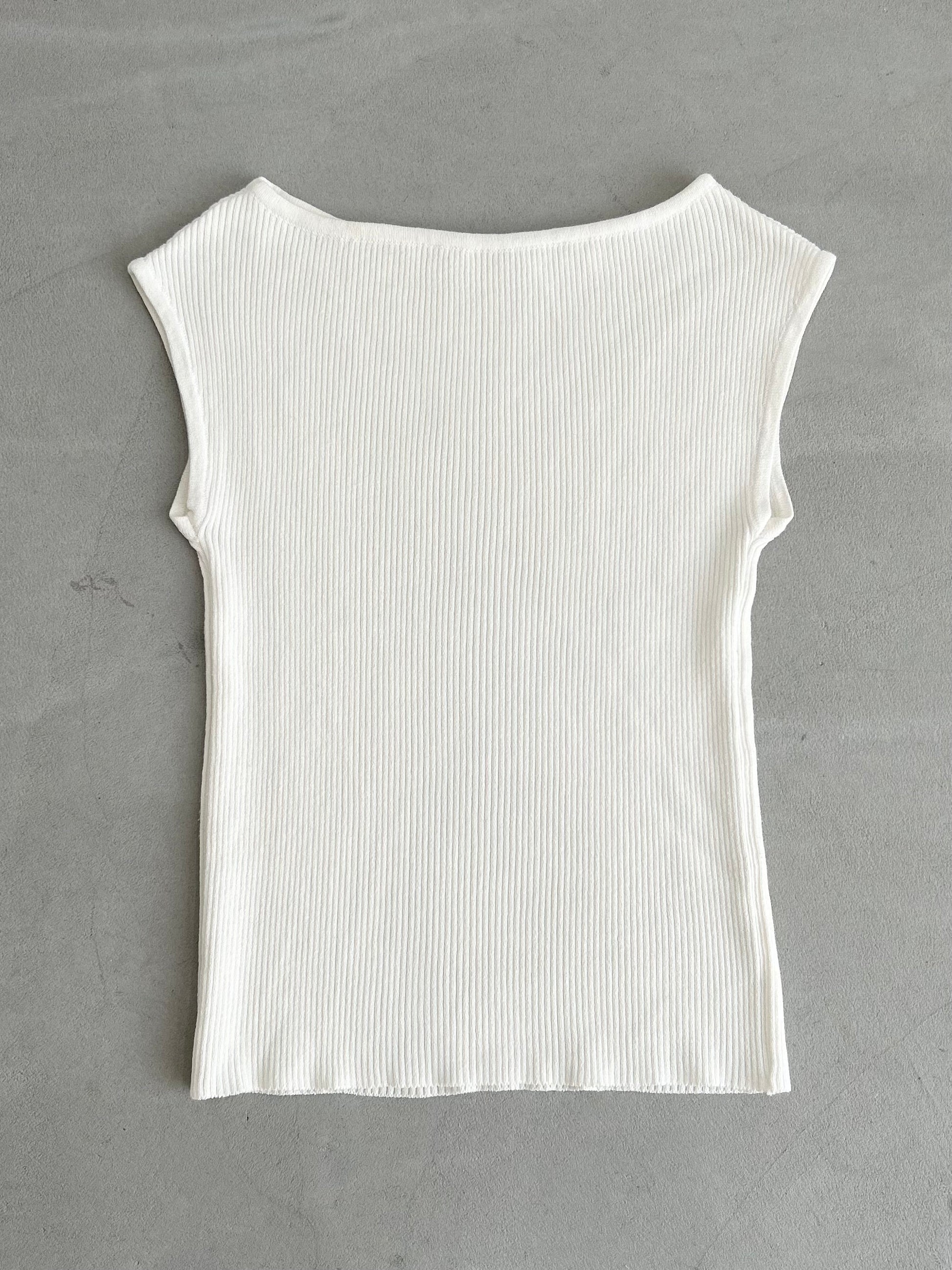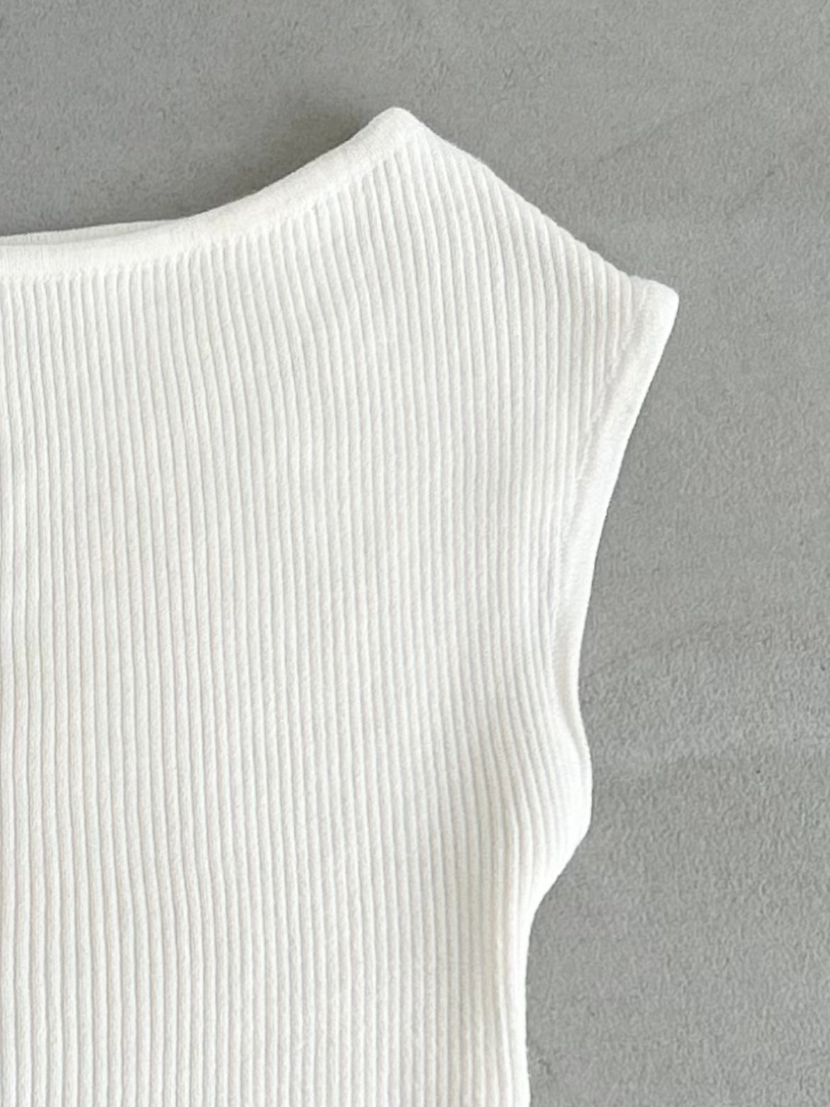 柔らかなリブニット素材で仕立てたノースリーブトップスは、ボートネックがデコルテを美しく引き立て、シンプルな中に静かな色気を漂わせます。