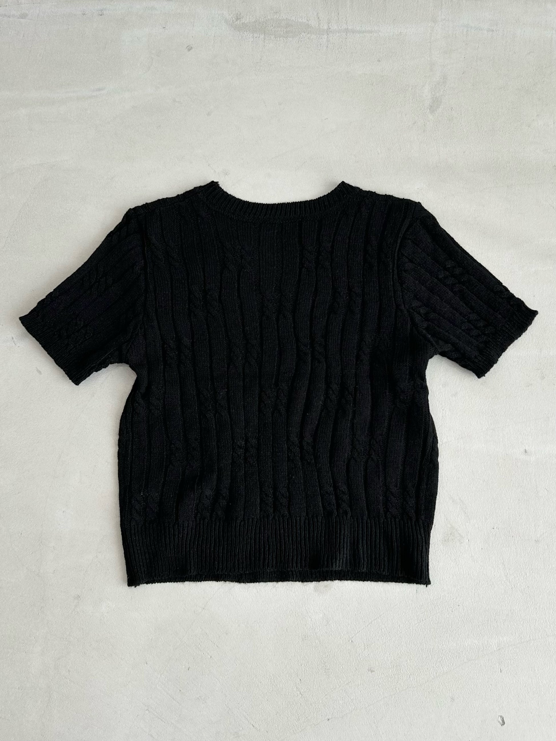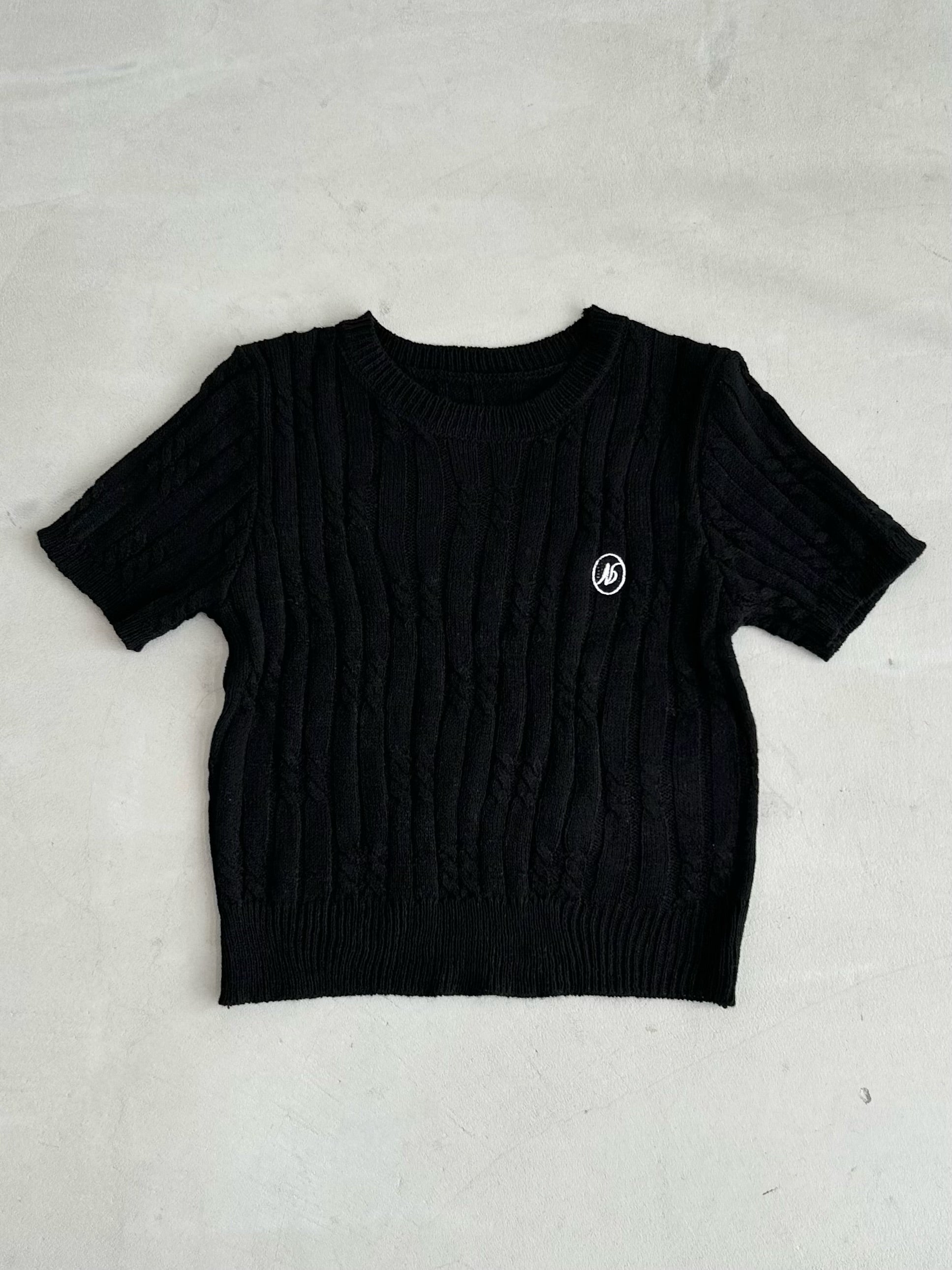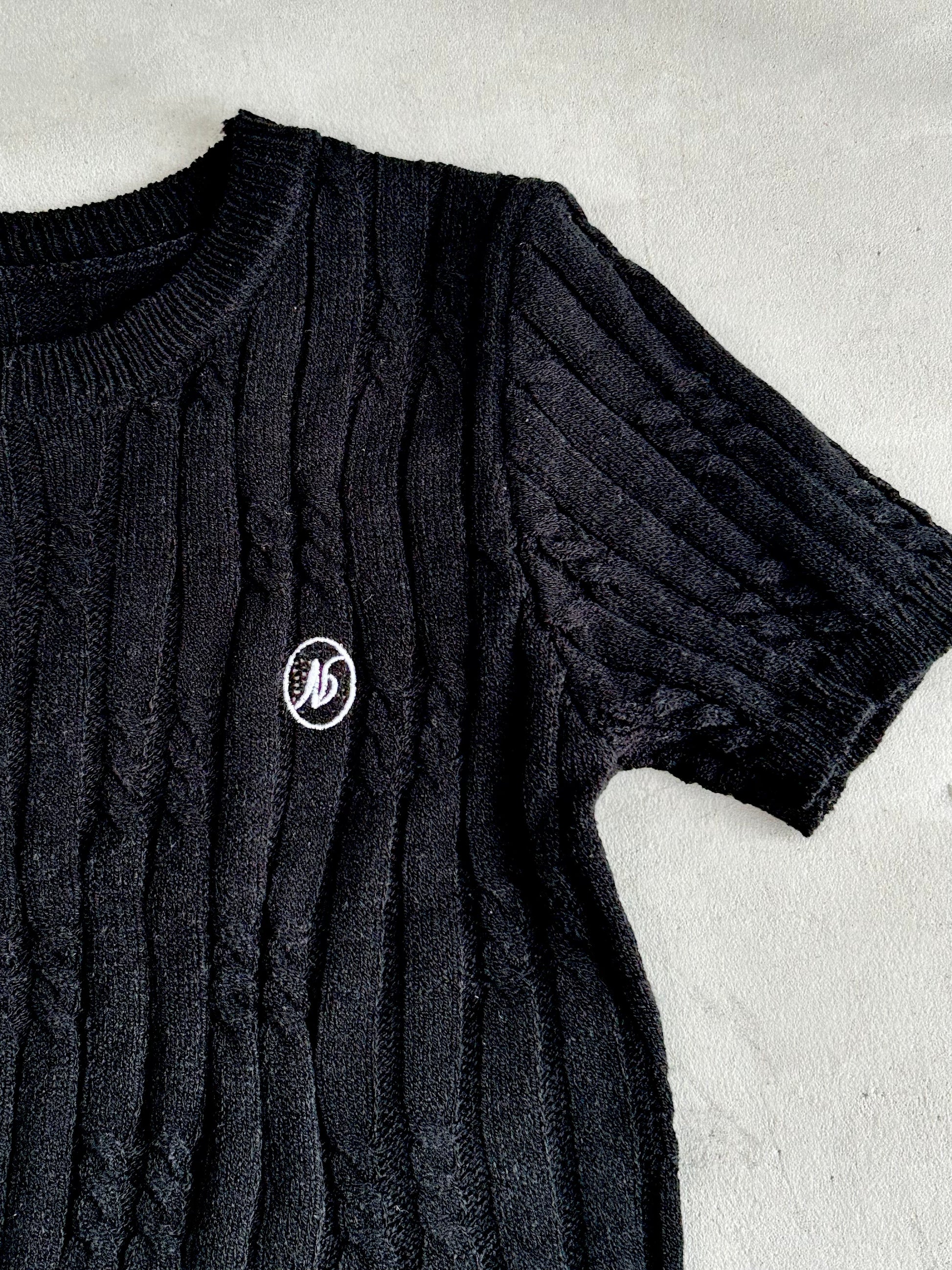 さりげないロゴ刺繍がワンポイントになった、上品なケーブル編みサマーニット。